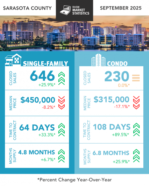 SARASOTA, Fla. (October 23, 2025) – The REALTOR® Association of Sarasota and Manatee (RASM) has released its September 2025 real estate market report, offering a comprehensive analysis of key trends across both counties. According to data from Florida REALTORS®, the housing market across Sarasota and Manatee counties showed steady momentum in September, as closed sales rose year-over-year for both single-family homes and condos. While more buyers returned to the market compared to last fall, prices continued to moderate, and homes took longer to sell, reflecting a shift toward a more balanced environment. Inventory levels remain higher than a year ago but have eased slightly in recent months, signaling that supply is stabilizing after a year of buildup. Overall, the region’s housing market is showing resilience, with increased activity and growing opportunities for buyers during more normalized conditions.