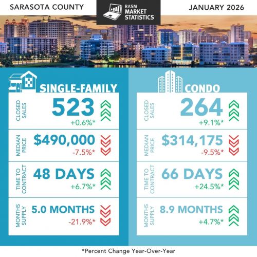 SARASOTA, Fla. (February 17, 2026) – The REALTOR® Association of Sarasota and Manatee (RASM) has released its January 2026 real‑estate market report, providing a snapshot of market conditions across the two counties. According to data from Florida Realtors®, January 2026 reflects a housing market that is adjusting rather than slowing down. In Sarasota County, sales improved in both the single-family and condo markets, while Manatee County experienced softer activity, particularly in single-family homes. Home prices declined in most segments, though Manatee’s single-family market saw a slight increase. Overall inventory levels decreased, keeping the single-family market relatively balanced, while condo and townhome inventory remains higher and gives buyers more options. Pending sales increased across most property types, which typically signals stronger closed sales in the months ahead. Although homes are taking longer to go under contract and close, the market remains active and positioned for steady movement as the year progresses.