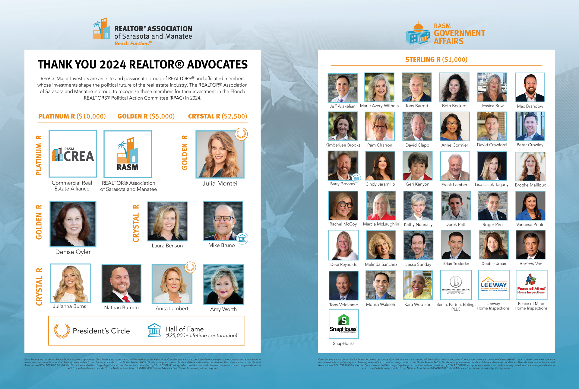 These REALTORS® have stepped up to advocate for policies that protect your rights as a homeowner, support affordable housing, and strengthen the neighborhoods we all live in. Their investment helps ensure your voice is heard in Tallahassee and beyond. You may even know one of them—these are local REALTORS® who care about more than just transactions. They care about your future.